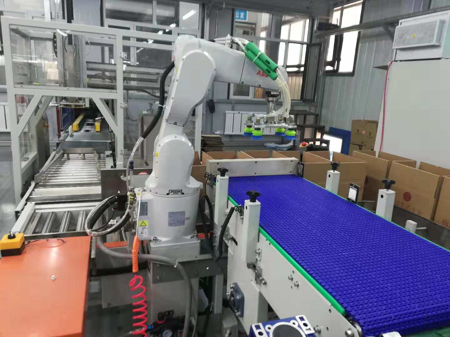 將產(chǎn)品通過進(jìn)料輸送帶輸送進(jìn)料,機(jī)器人及夾具到產(chǎn)品上方,抓取產(chǎn)品后移動到裝箱位,按事先輸入的裝箱形式進(jìn)行產(chǎn)品裝箱。