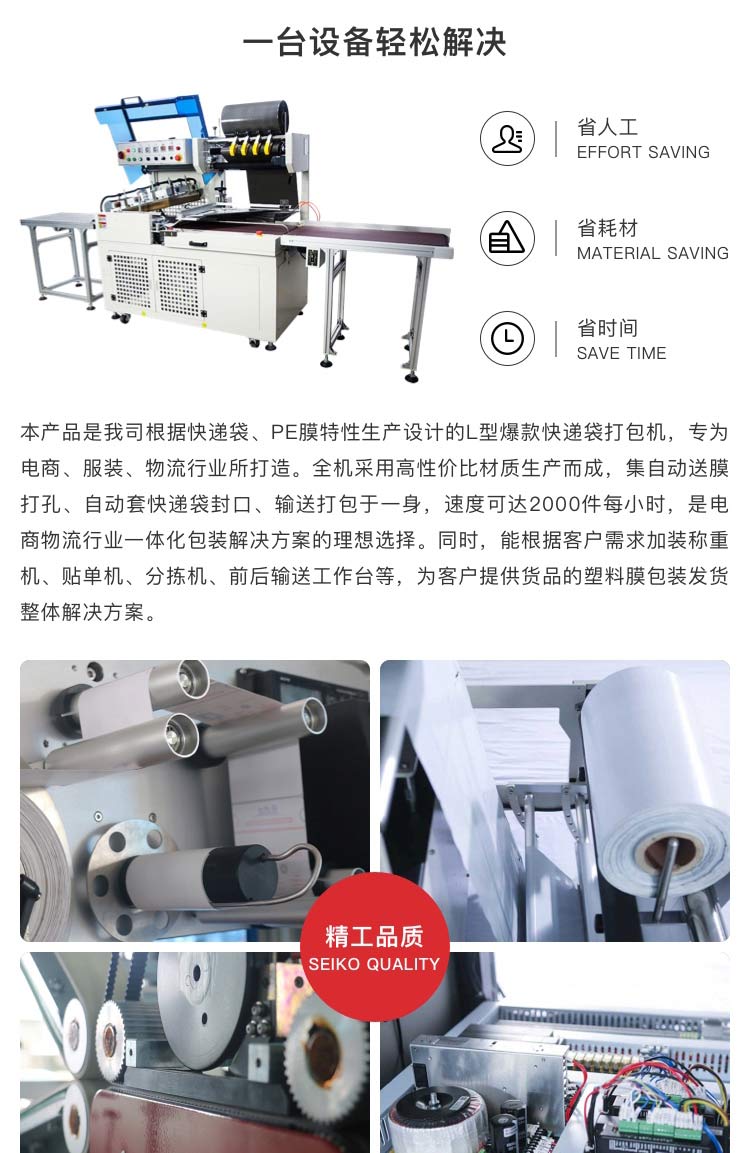 介紹:本產(chǎn)品是我司根據(jù)快遞袋、PE膜特性生產(chǎn)設(shè)計(jì)的L型快遞袋打包機(jī),專為電商、服裝、物流行業(yè)所打造。全機(jī)采用高性價(jià)比材質(zhì)生產(chǎn)而成,集自動(dòng)送膜打孔、自動(dòng)套快遞袋封口、輸送打包于一身,速度可達(dá)2000件每小時(shí),是電商物流行業(yè)一體化包裝解決方案的理想選擇。同時(shí),能根據(jù)客戶需求加裝稱重機(jī)、貼單機(jī)、分揀機(jī)、前后輸送工作臺(tái)等,為客戶提供貨品的塑料膜包裝發(fā)貨整體解決方案。