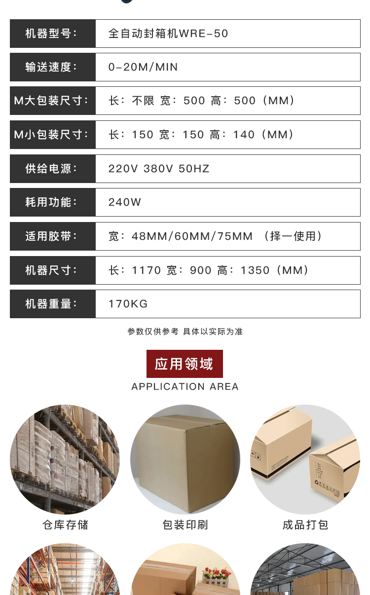 介紹:全自動封箱機WRE-50可以自動調(diào)節(jié)紙箱高度及寬度,更換不同規(guī)格紙箱無需人工調(diào)節(jié);推薦更換紙箱規(guī)格頻繁的用戶使用。 該款封箱機廣泛應(yīng)用于食品、醫(yī)藥、玩具、煙草、日化、電子等行業(yè)。 產(chǎn)品別稱:全自動封箱機、工字封箱機、一字封箱機、十字封箱機、四角邊封箱機、上下驅(qū)動封箱機、左右驅(qū)動封箱機、快遞封箱機、電商封箱機、膠帶封箱機、快速封箱機、可調(diào)封箱機、伺服封箱機